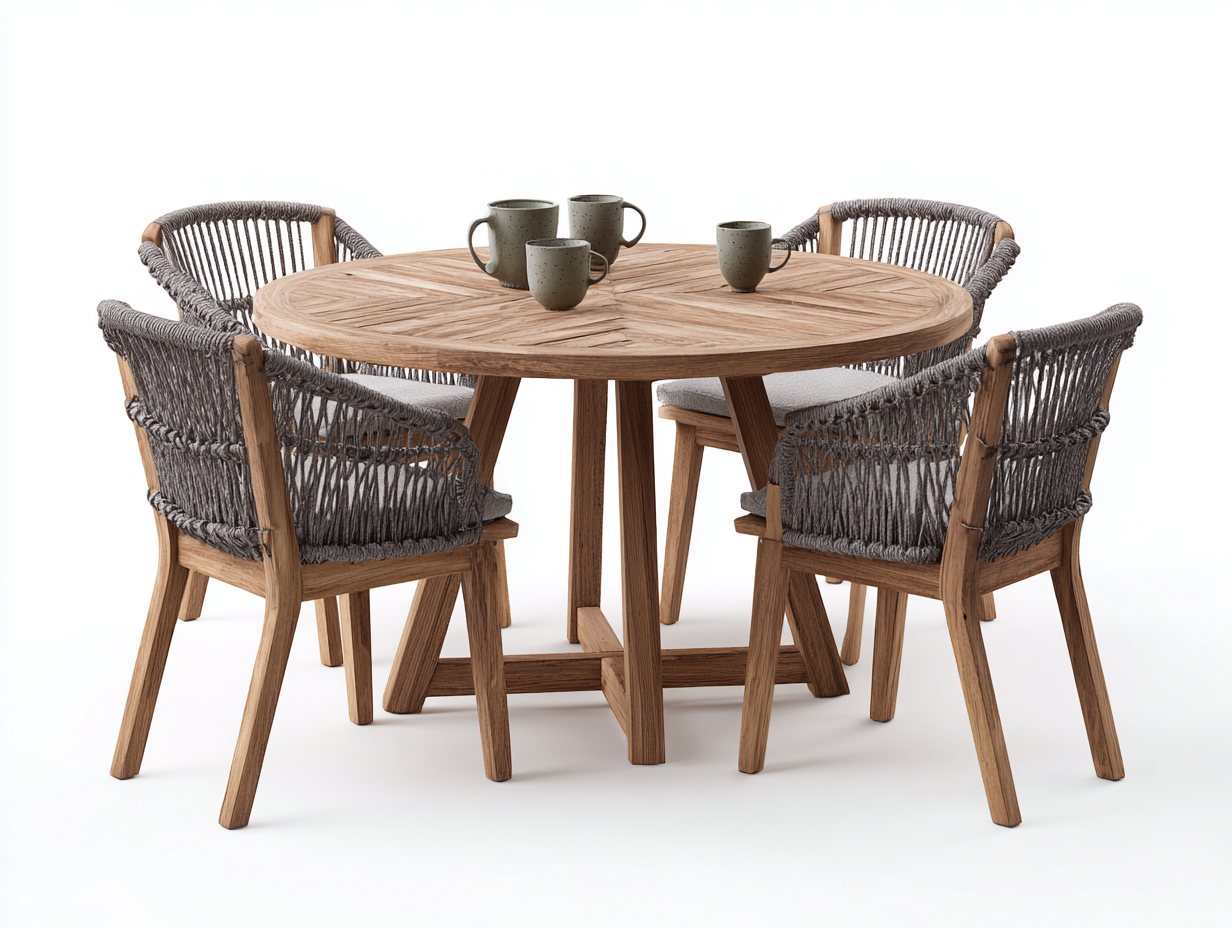 La mesa está fabricada en madera resistente con acabado natural que resalta la textura del material. Las sillas combinan estructura de madera con respaldo trenzado en cuerda resistente de color gris, lo que aporta un estilo moderno y natural al conjunto.
