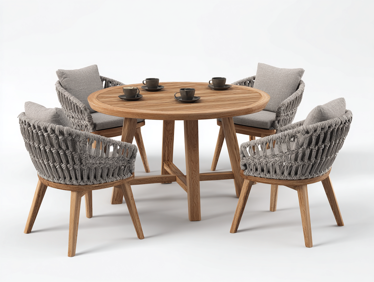 La mesa está fabricada en madera resistente con acabado natural que aporta estabilidad y durabilidad. Las sillas incorporan estructura sólida con respaldo tejido en cuerda de color gris que proporciona ventilación y un aspecto decorativo elegante.