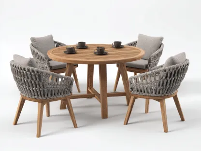 El diseño redondo de la mesa facilita la interacción entre los comensales mientras optimiza el espacio en exteriores. Las sillas con cojines ofrecen una experiencia de asiento cómoda y estable adecuada para reuniones familiares o encuentros al aire libre.