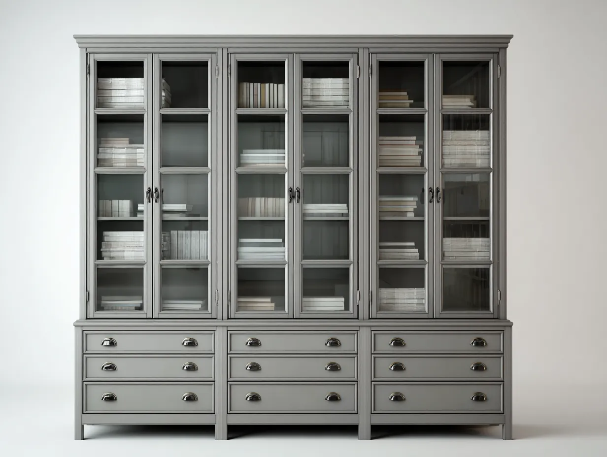 La estructura está fabricada en madera resistente con acabado en color gris que combina fácilmente con distintos estilos de interior. Las puertas cuentan con paneles de vidrio transparente que permiten exhibir libros u objetos decorativos. Los tiradores metálicos aportan un toque elegante al conjunto.