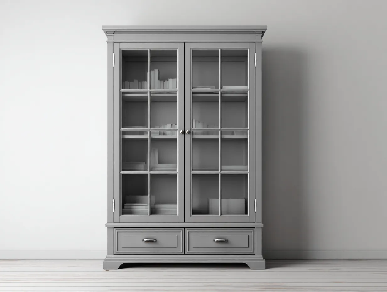 La estructura está fabricada en madera con acabado en color gris claro que aporta un aspecto elegante y luminoso al espacio interior. Las puertas de vidrio permiten visualizar el contenido del mueble, mientras que los tiradores metálicos completan el diseño con un detalle refinado.