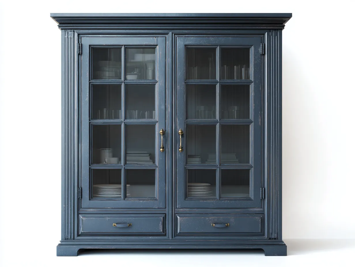 La estructura está fabricada en madera con acabado en color azul oscuro que aporta una presencia sólida y distinguida. Las puertas de vidrio permiten visualizar el interior, mientras que los tiradores metálicos añaden un detalle decorativo al conjunto.