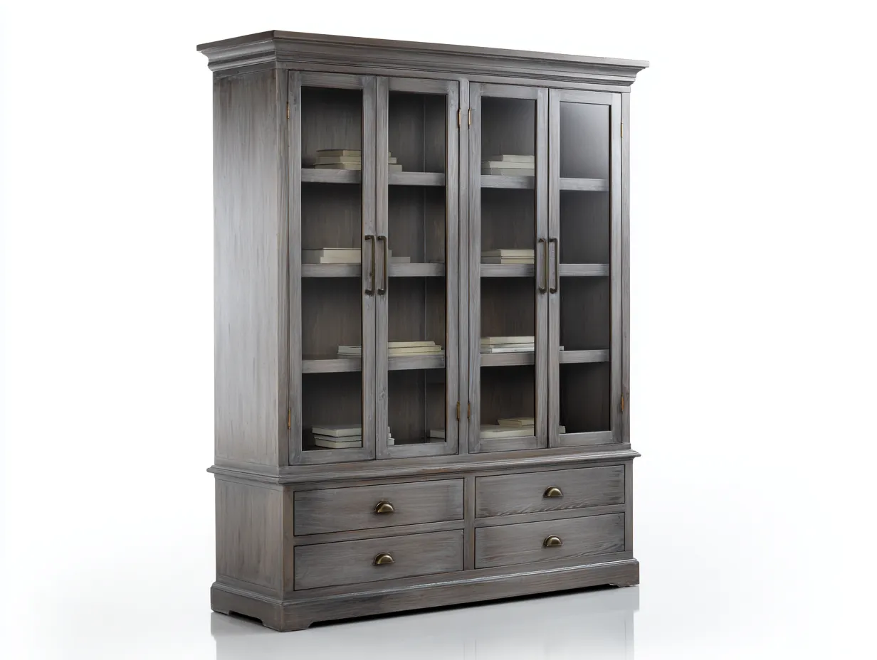 Esta estantería combina elegancia clásica y funcionalidad para ofrecer un amplio espacio de almacenamiento y exhibición. Su diseño con puertas de vidrio permite organizar libros, vajilla u objetos decorativos mientras mantiene una apariencia ordenada y sofisticada en el hogar.