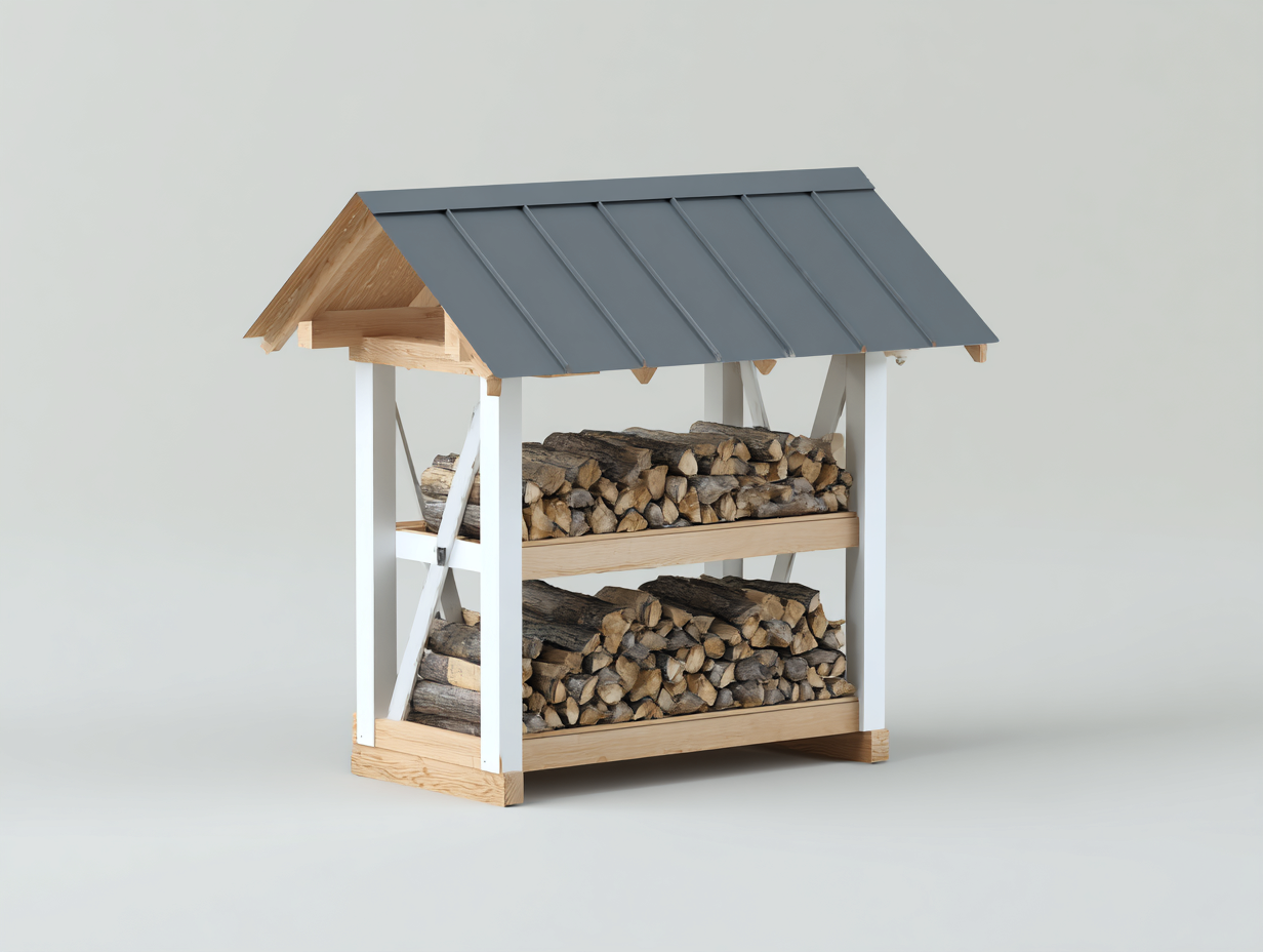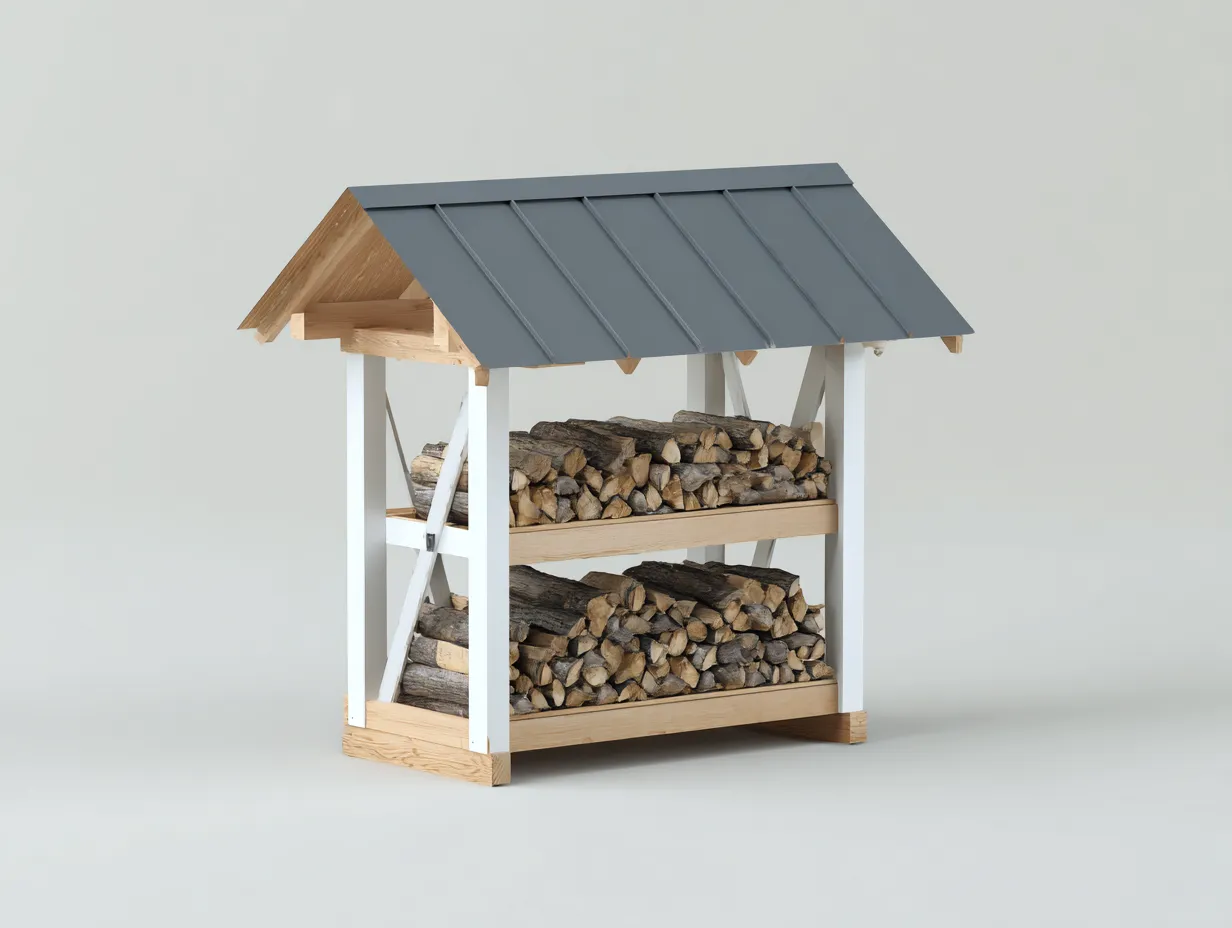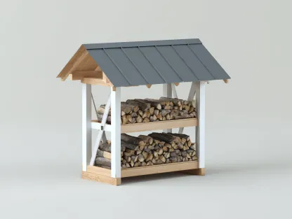 Este leñero de exterior ofrece una solución práctica y ordenada para almacenar leña en el jardín o patio. Su diseño con techo inclinado protege la madera de la lluvia mientras permite una ventilación adecuada para conservar la leña en buenas condiciones.