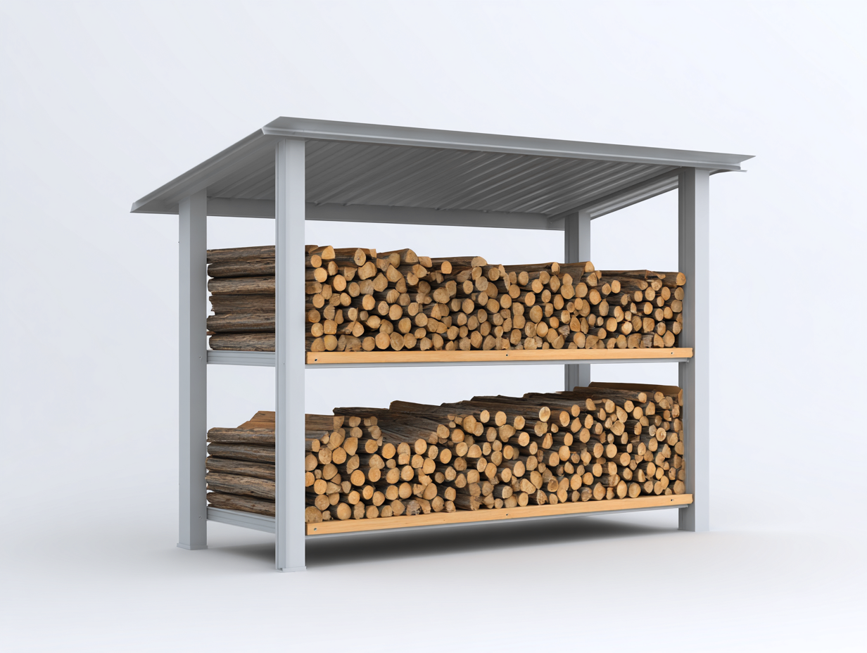 El diseño con dos niveles permite organizar la leña de forma eficiente y aprovechar mejor el espacio. La estructura abierta favorece la ventilación natural, ayudando a mantener la madera seca y lista para su uso.